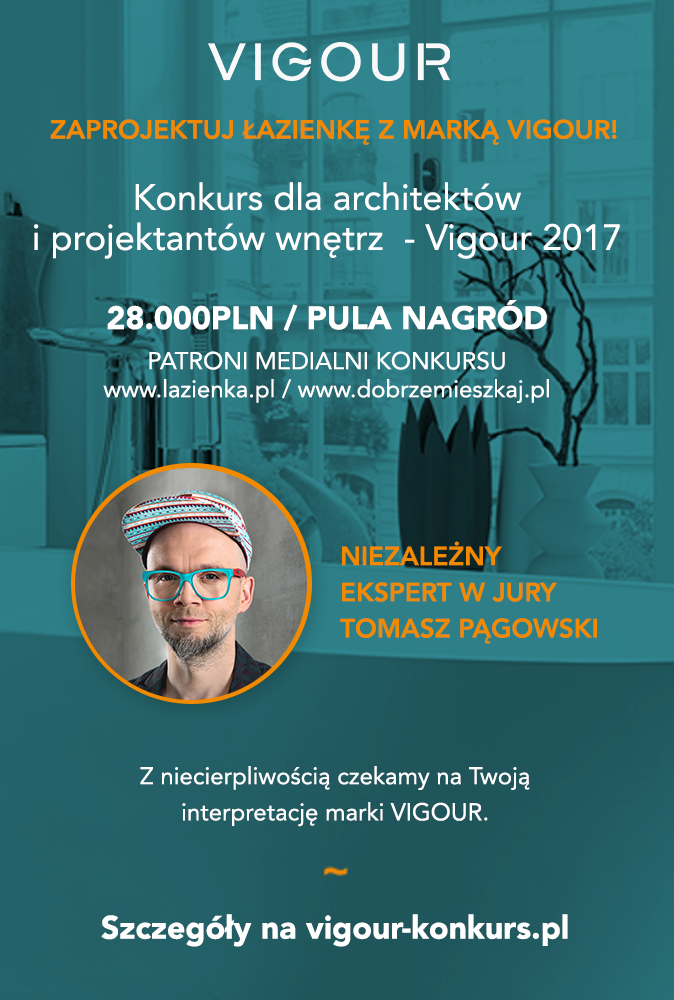 Pierwszą propozycją jest konkurs dla architektów i projektantów wnętrz „Vigour 2017“, który zachęca do zaprojektowania łazienki w oparciu o serie produktów Vigour. Należy zgłosić projekt: wnętrza inwestora indywidualnego (łazienki/pokoju kąpielowego w nowym budynku o powierzchni powyżej 10 m2, łazienki modernizowanej o powierzchni do 6 m2) lub wnętrza inwestycyjnego (łazienki w hotelu lub pensjonacie, łazienki w inwestycji deweloperskiej, łazienki w instytucji publicznej, łazienki w obiekcie gastronomicznym, handlowym, usługowym). Główna nagroda do zdobycia to 10 000 zł, termin składania projektów upływa 31 grudnia 2017r. Szczegóły konkursu na stronie www.vigour-konkurs.pl.
