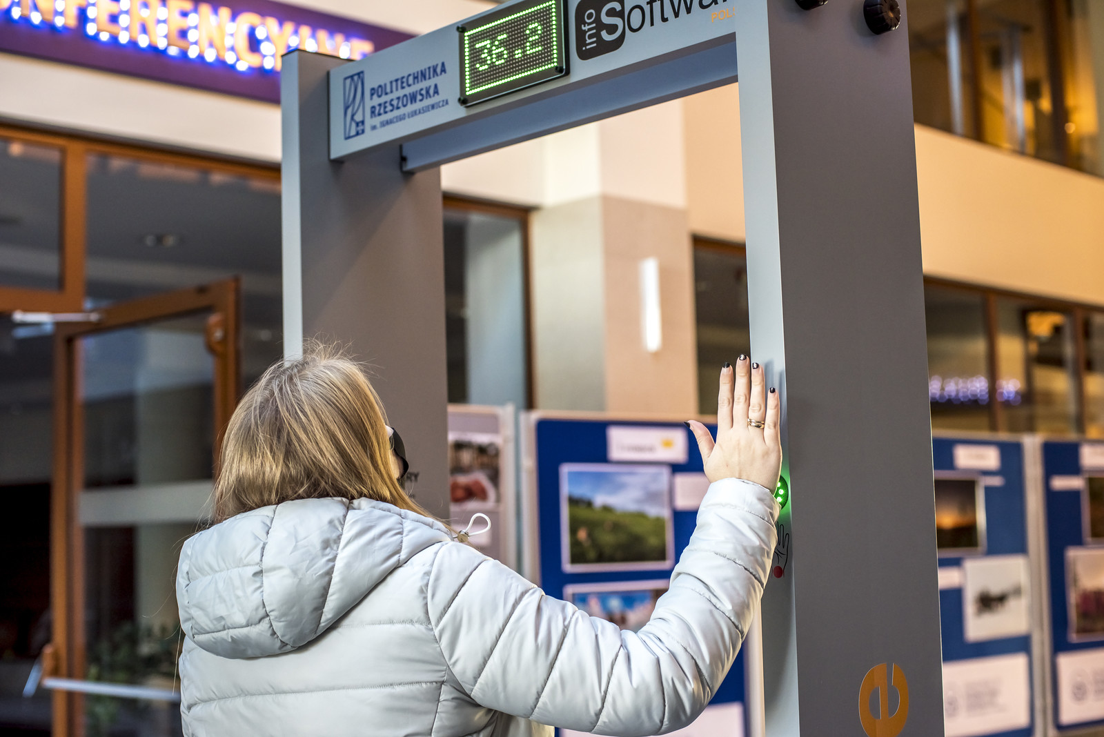 Bramki do zdalnego pomiaru temperatury to jeden z elementów ochrony stosowanej na Politechnice Rzeszowskiej, używany z uwagi na wysoki poziom zagrożenia wynikający z bezpośrednich kontaktów międzyludzkich. System zaprezentowany przez firmę InfoSoftware Polska nie tylko umożliwia kontrolę temperatury ciała, lecz także pozwoli na prowadzenie dalszych badań w zakresie efektywnej i bezpiecznej komunikacji, zdalnego monitoringu i sterowania zasobami w heterogenicznym rozproszonym środowisku.