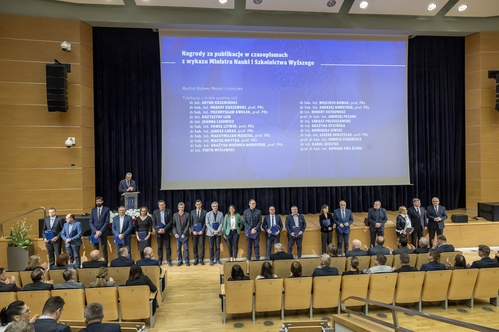 Nagrodami za publikacje o liczbie punktów 140 zostali wyróżnieni: dr hab. inż. Katarzyna Antosz, prof. PRz, dr inż. Krzysztof Balawender, dr inż. Anna Bazan, dr inż. Łukasz Bąk, dr inż. Magdalena Bucior, prof. dr hab. inż. Grzegorz Budzik, dr inż. Barbara Ciecińska, mgr inż. Karolina Czerwińska, dr hab. inż. Marcin Drajewicz, prof. PRz, dr hab. inż. Andrzej Dzierwa, prof. PRz, dr hab. inż. Tomasz Dziubek, prof. PRz, dr hab. inż. Ryszard Filip, prof. PRz, dr hab. inż. Wiesław Frącz, prof. PRz, dr inż. Michał Gdula, dr hab. inż. Wiesław Graboń, prof. PRz, dr inż. Andrzej Gradzik, dr hab. inż. Witold Habrat, prof. PRz, dr inż. Grzegorz Janowski, dr inż. Artur Jaworski, prof. dr hab. inż. Andrzej Kawalec, dr hab. inż. Rafał Kluz, prof. PRz, mgr inż. Dariusz Konieczny, dr hab. Waldemar Koszela, prof. PRz, dr inż. Barbara Kościelniak, dr inż. Artur Krzemiński, dr hab. inż. Andrzej Kubit, prof. PRz, dr hab. inż. Hubert Kuszewski, prof. PRz, dr hab. inż. Przemysław Kwolek, prof. PRz, dr inż. Krzysztof Lew, dr inż. Joanna Lisowicz, dr hab. inż. Paweł Litwin, prof. PRz, dr hab. inż. Janusz Lubas, prof. PRz, dr hab. inż. Maksymilian Mądziel, prof. PRz, dr hab. inż. Maciej Motyka, prof. PRz, dr hab. inż. Grażyna Mrówka-Nowotnik, prof. PRz, dr hab. inż. Jacek Mucha, prof. PRz, dr inż. Piotr Myśliwiec, dr hab. inż. Wojciech Nowak, prof. PRz, dr hab. inż. Andrzej Nowotnik, prof. PRz, dr inż. Robert Ostrowski, prof. dr hab. inż. Andrzej Pacana, prof. dr hab. inż. Paweł Pawlus, dr inż. Przemysław Podulka, dr inż. Łukasz Przeszłowski, dr inż. Grażyna Ryzińska, dr inż. Dominika Siwiec, dr hab. inż. Leszek Skoczylas, prof. PRz, prof. dr hab. inż. Dorota Stadnicka, dr inż. Karol Szostek, prof. dr hab. inż. Romana Ewa Śliwa, dr inż. Łukasz Święch, dr hab. inż. Sławomir Świrad, prof. PRz, prof. dr hab. inż. Tomasz Trzepieciński, dr inż. Paweł Turek, dr inż. Adam Ustrzycki, dr hab. inż. Lucjan Witek, prof. PRz, dr inż. Waldemar Witkowski, dr hab. inż. Paweł Woś, prof. PRz, dr inż. Sławomir Woś, dr inż. Marta Wójcik, dr inż. Małgorzata Zaborniak, dr inż. Waldemar Ziaja, dr inż. Marta Żyłka.